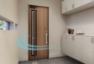 この玄関ドアは一部が窓となっており、窓部分が室内側に縦滑りして開き、風を取り込むことができます。